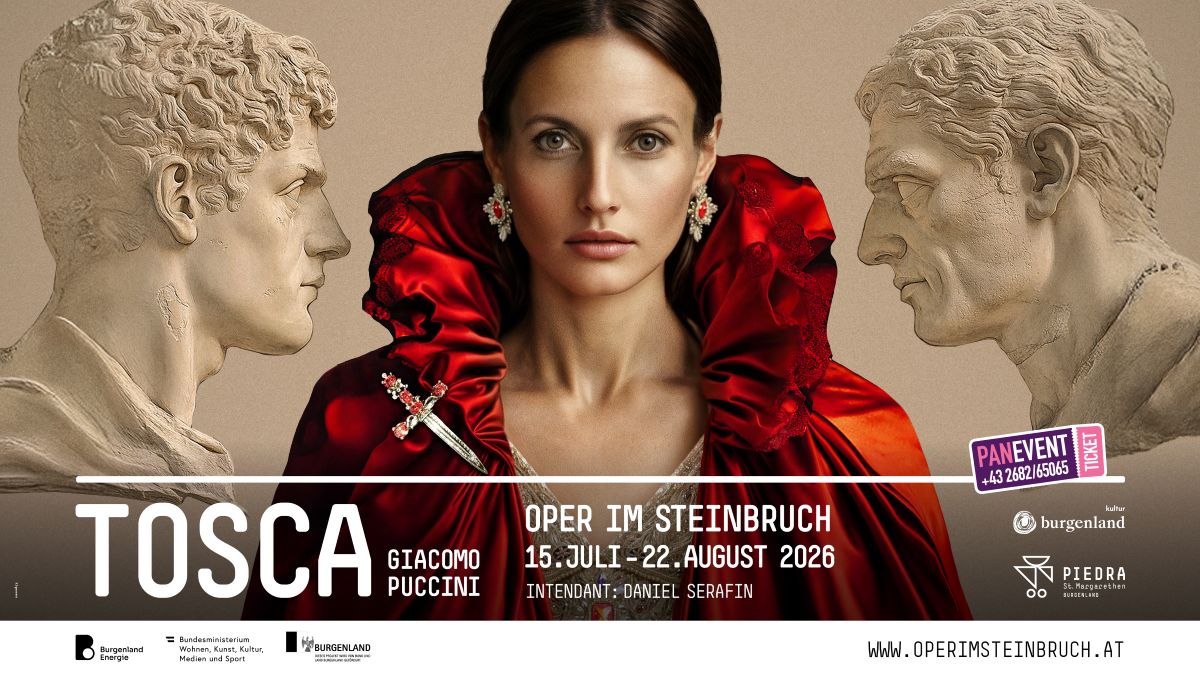 Einzigartige Kulisse für große Emotionen: Eine Geschichte um Liebe, Eifersucht, Gewalt und Intrigen trifft auf atemberaubende Klänge: Mit Giacomo Puccinis Melodramma Tosca kehrt 2026 vom 15.07 – 22.08 eine der beliebtesten Opern der Welt in den Steinbruch St. Margarethen, auf die schönste Freiluftbühne Europas, zurück. Ein Feuerwerk der Emotionen mit packenden Melodien, die in der Felslandschaft des Steinbruchs St. Margarethen den perfekten Widerhall finden.