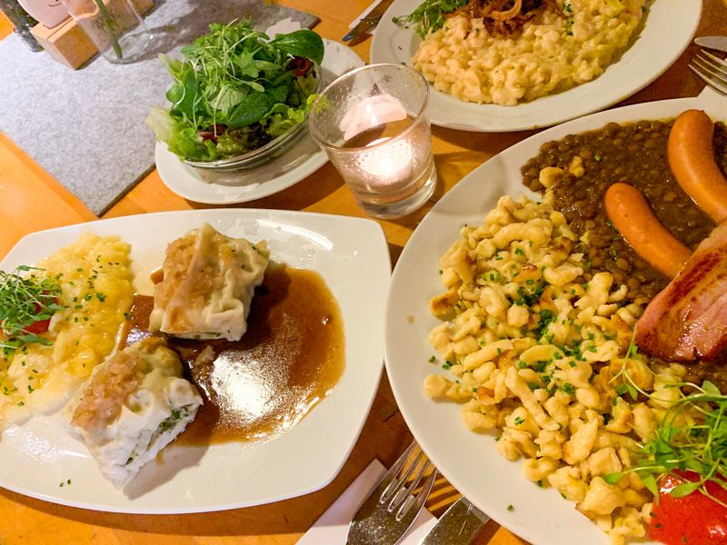 * Hauptgerichte zur Wahl: Linsen mit Spätzle, Speck & Saitenwürstle, hausgemachte Käsespätzle mit Röstzwiebeln & Blattsalat, Geschmälzte Maultaschen mit Zwiebeln & hausgemachtem Kartoffelsalat, mit Frischkäse gefüllte Kartoffeltaschen auf buntem Salat