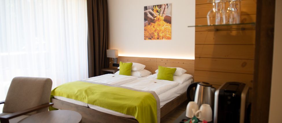 Die 48 hellen Zimmer mit Balkon oder Terrasse spiegeln die Farben der Natur wider.